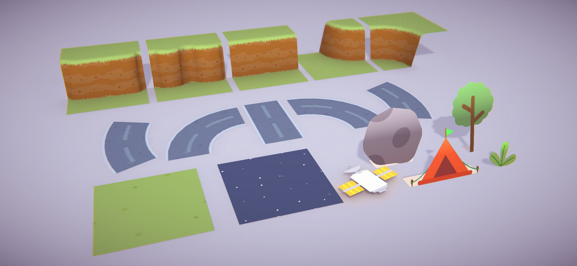 Even at the concept stage it was important to work out how the map would be built using as little assets as possible. The current approach is to procedurally generate the map and so it is built using a modular tile system with changeable textures depending on the topic type. Popup assets use an atlas template that is designed to allow for different props to be quickly changed on the existing model by swapping textures.